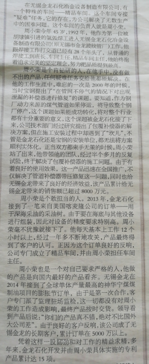 多年来周小荣师傅作为公司补偿器精品班长,带领一班人,为公司承接制造大型、复杂、特殊用途和特种材料的补偿器做出了贡献,是大家学习的榜样。